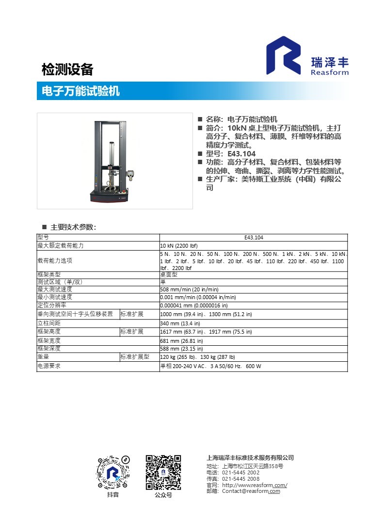 型号:E43.104 功能:高分子材料、复合材料、包装材料等的拉伸、弯曲、撕裂、剥离等力学性能测试。